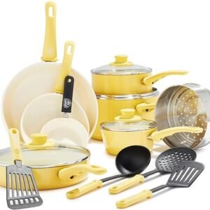 GreenLife Soft Grip Healthy Ceramic Nonstick 16 Piece Kitchen Cookware Pots and Frying Sauce Saute Pans Set, PFAS-Free with Kitchen Utensils and Lid, Dishwasher Safe, Yellow