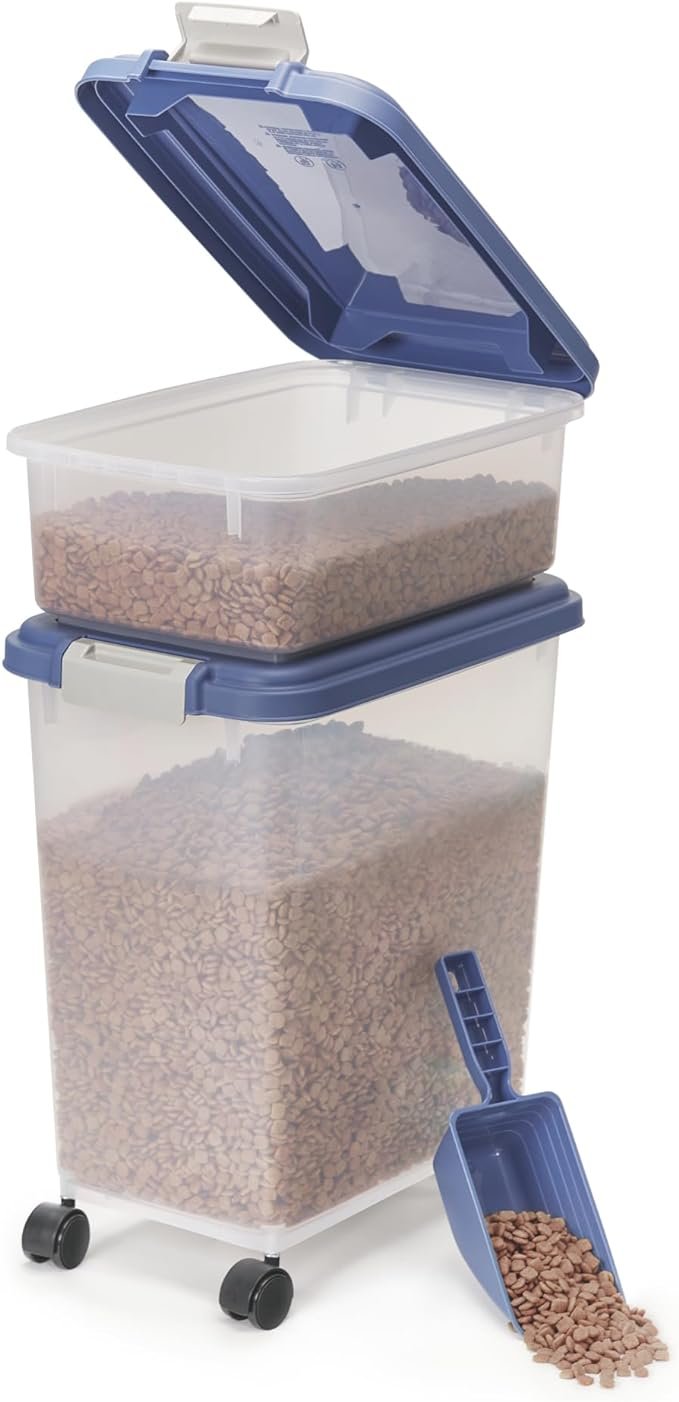 CONTENTS: 10 Lbs / 12 Qt storage container stacks on the 25 Lbs / 33 Qt storage container, one matching 2-cup food scoop, and one set of wheels. Included scoop makes measuring food easy and attachable casters make it easy to roll it around